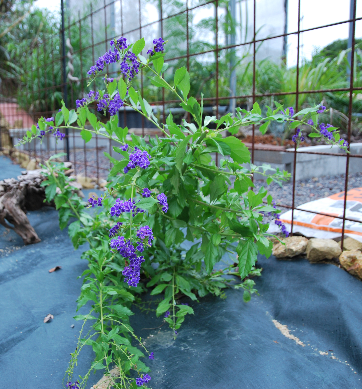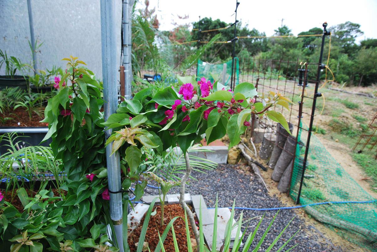 成長が早くヤシに覆いかぶさってしまうので結束バンドで単管パイプに這わせていきます 冬までに天井まで届きそう