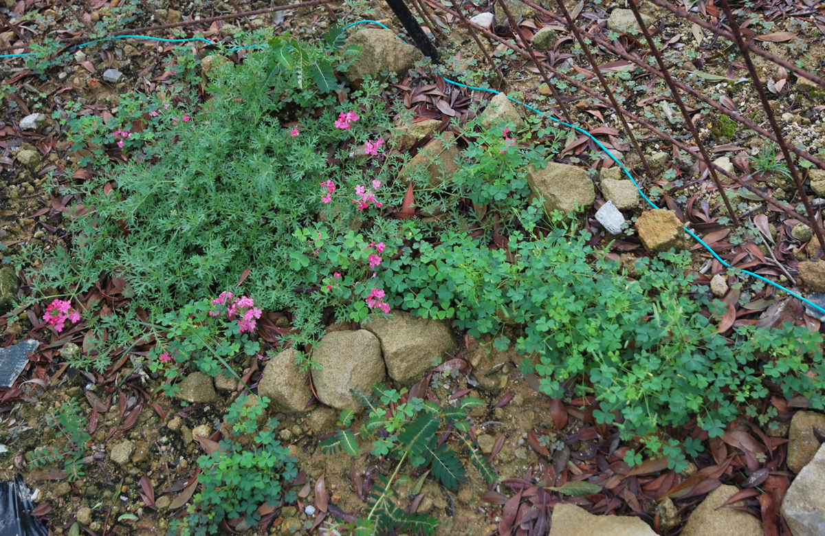 ピンクの花は前々回植えたグランドカバーのタピアン カタバミは前回残らず抜いたはずが、すでに種をつけていた