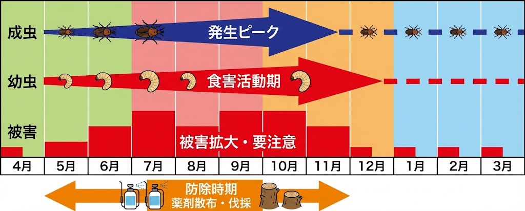 図のオレンジ色の矢印が示す通り、春から秋にかけて継続的な対策(薬剤散布や注入)を行うことが、ヤシを守る唯一の手段です。