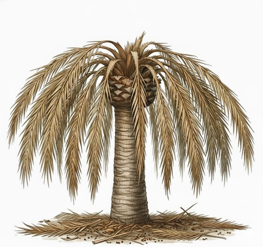 | 葉が青々と茂り、上向きに力強く広がっています。 | 幼虫が成長点(パームハート)を食べてしまうため、 中央の葉が茶色く枯れ、重力に負けて垂れ下がります。 この傘が垂れたような姿になったら 内部で食害が進んでいる末期的なサインです。 |