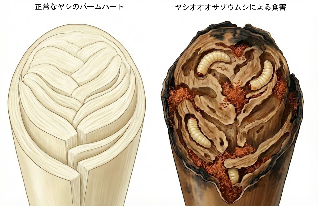 ヤシは「パームハート」と呼ばれる唯一の生長点が侵されると枯死し二度と芽が出ることはありません。