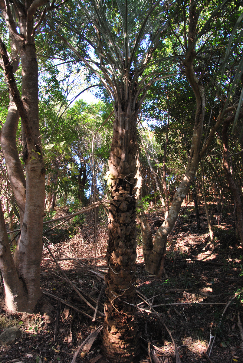 左上のニカウヤシは世界で最も南(南半球)に自生するヤシ 成長は遅いがほかのヤシが休眠する寒い季節でも着実に成長する