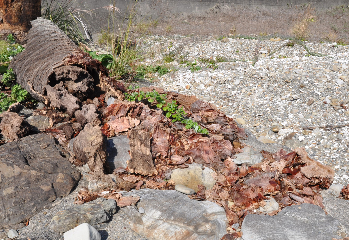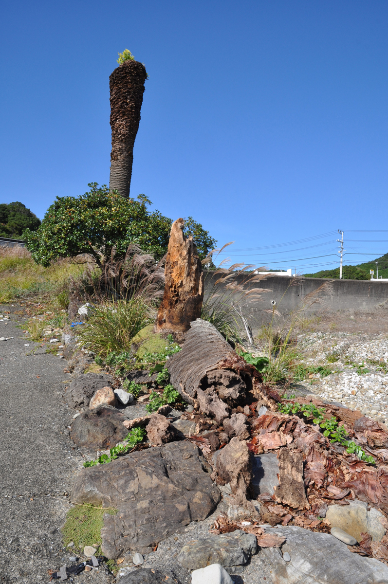 黒潮椰子園の土地にも倒れたヤシがありました。株元の形状をみるとカナリーヤシで間違いありません。