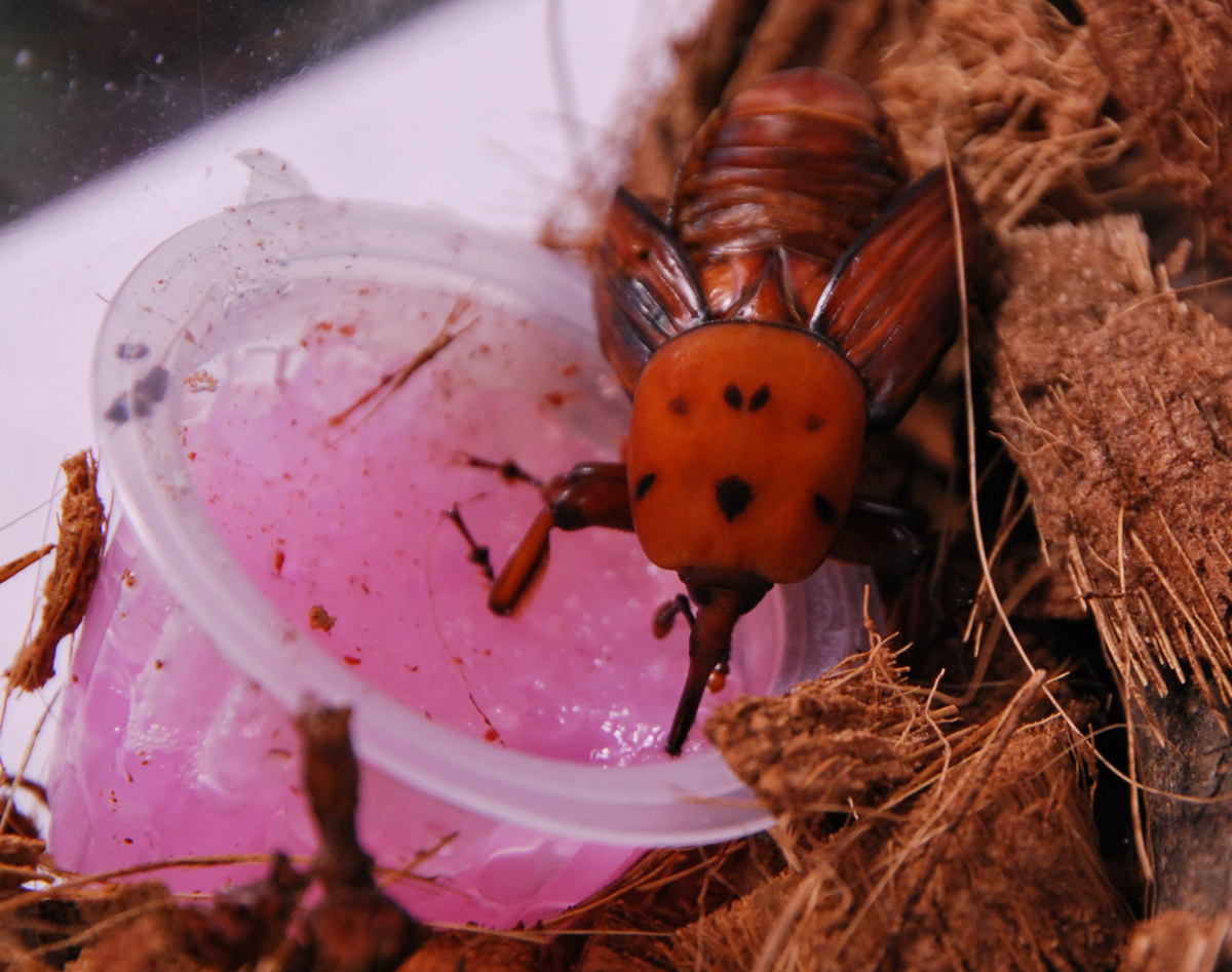 餌はイモとかニンジンとか、サゴヤシと同じでんぷん質を食べるそうで、虫ゼリーも食べるということで与えてみます。