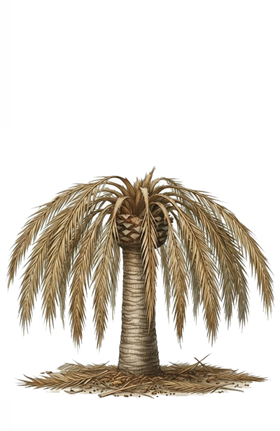 | 葉が青々と茂り、上向きに力強く広がっています。 | 幼虫が成長点(パームハート)を食べてしまうため、 中央の葉が茶色く枯れ、重力に負けて垂れ下がります。 この傘が垂れたような姿になったら 内部で食害が進んでいる末期的なサインです。 |